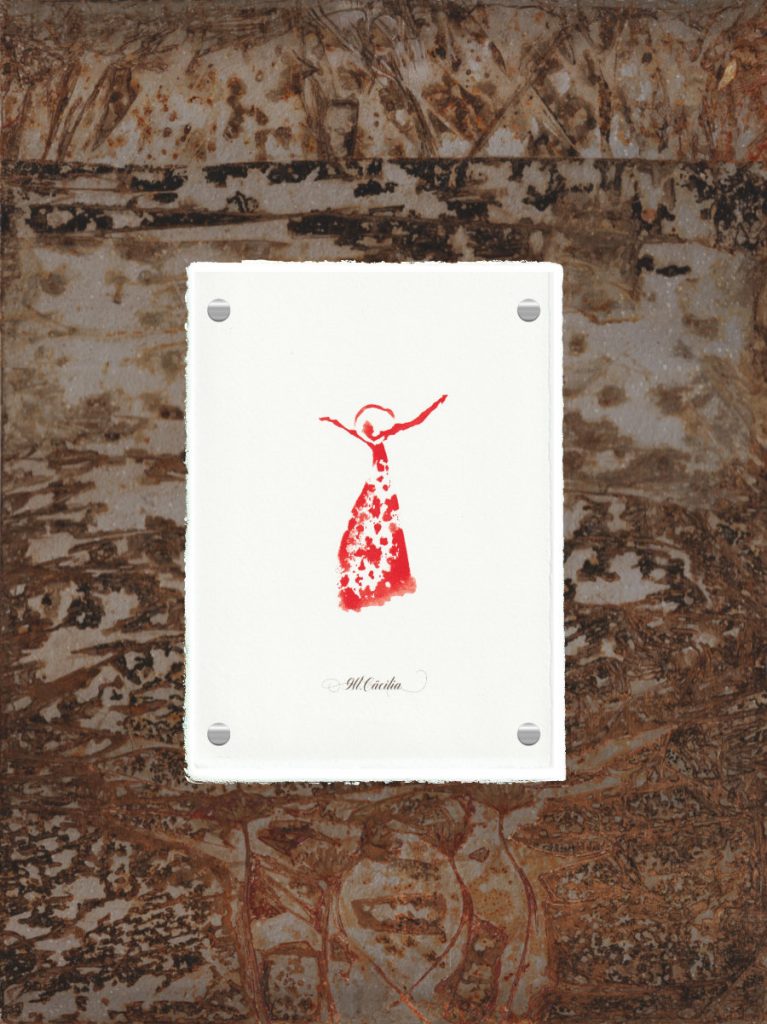 Rote Dokumententinte auf handgeschöpftem Büttenpapier, montiert auf gerosteter Eisenplatte