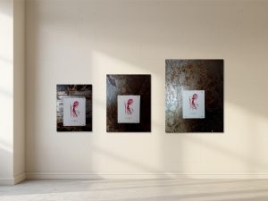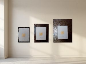 The two images illustrate, by way of example, how the same artwork appears on iron plates of different sizes. On the left, a motif on handmade paper in approximately A4 format (gold leaf) is shown; on the right, a motif in approximately A5 format (red document ink). Both image formats are presented on iron plates in sizes Small, Medium and Large, making it possible to clearly perceive how the size of the plate influences the artwork’s impact and spatial presence.