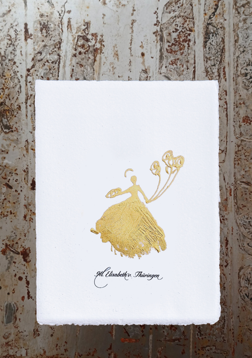 This hand-painted, elegant wall art from the Wonnereich studio combines traditional heritage with modern expressiveness. St. Elisabeth of Thuringia, known for her tireless charity, is depicted here in a cheerful and lively movement that embodies lightness and joy.