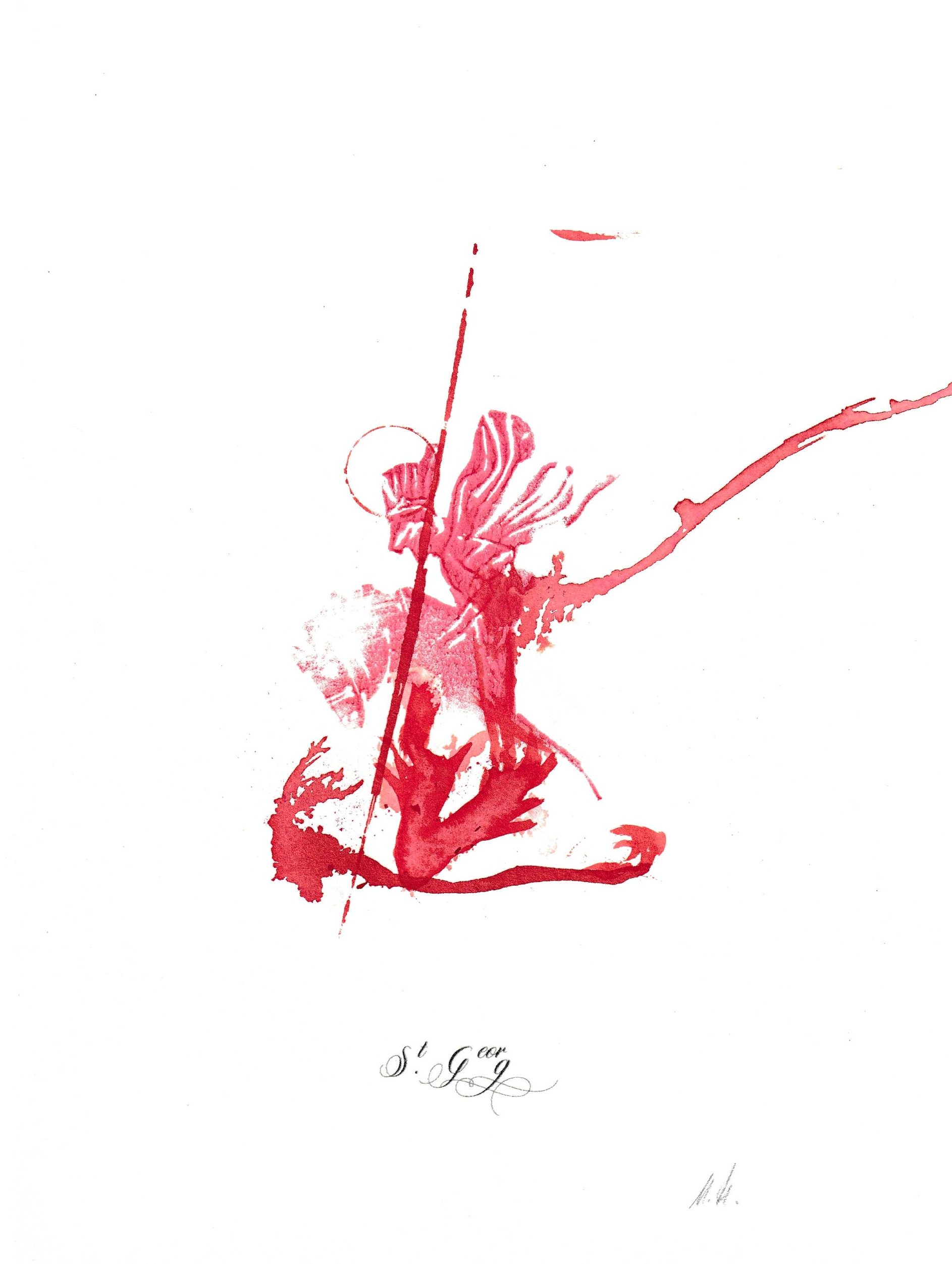 This artwork pays homage to Saint George in a modern, poetic way. The dragon, symbolizing fear and obstacles, lies defeated on the ground, while George's dynamic posture embodies strength and determination. The red ink recalls martyrdom and simultaneously represents inexhaustible energy. As an artwork for living spaces, offices, or meditation areas, it creates an inspiring atmosphere that provides strength and confidence every day.