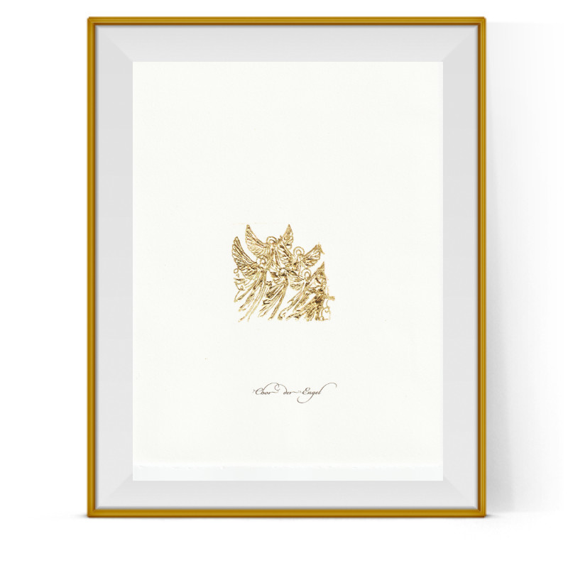 Jedes Bild wird auf hochwertigem A4-Büttenpapier mit feiner Relieftechnik gefertigt. Das zentrale Motiv, die Darstellung eines Engels, misst etwa 8×8 cm. Die Flügel, kunstvoll gestaltet und harmonisch proportioniert, verleihen den Figuren eine besondere Dynamik. Die Verwendung von reinem Blattgold sorgt für ein faszinierendes Lichtspiel, das je nach Tageszeit und Umgebung eine neue Wirkung entfaltet.