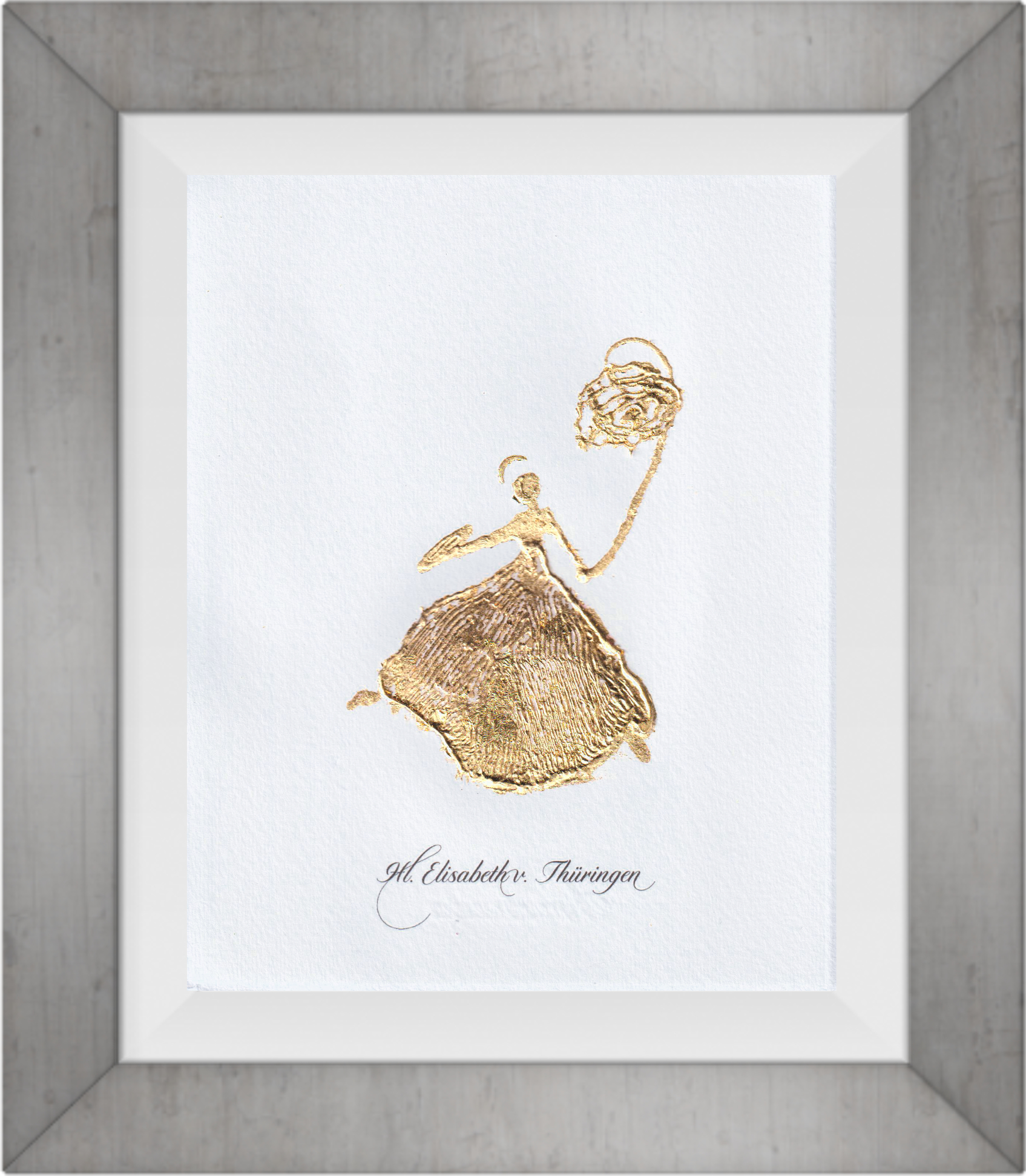 Diese handgemalte edle Wandkunst aus dem Wonnereich-Atelier vereint das traditionelle Erbe mit moderner Ausdruckskraft. Die Hl. Elisabeth von Thüringen, bekannt für ihre unermüdliche Nächstenliebe, wird hier in einer fröhlichen und beschwingten Bewegung dargestellt, die Leichtigkeit und Freude verkörpert.