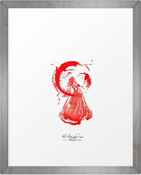Das Motiv in Rot besteht aus echter, handgefertigter Dokumententinte. Die digitalen Elemente (Schriftzeichen) sind mit herkömmlicher Druckertinte aufgebracht.